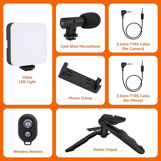 6-in-1 Vlogging Kit for All Phones | Tripod, LED Video Light, Cardioid Microphone, Phone Clip, Bluetooth Remote & Microphone Cable | Useful for Live Broadcasting, Video Calling